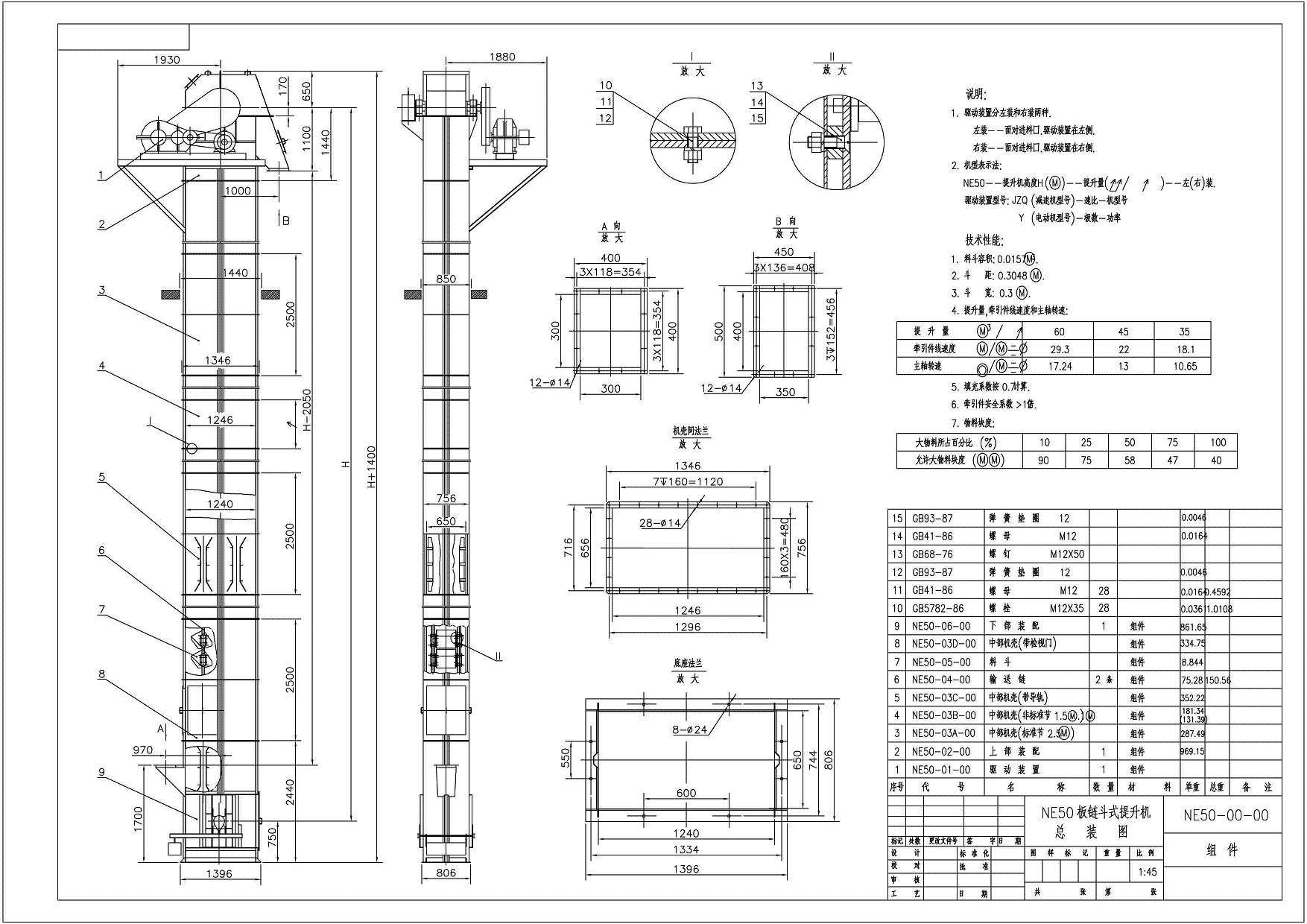 [NE50斗式提升機(jī)總裝圖]  [NE50斗式提升機(jī)外形尺寸]  [NE50斗式提升機(jī)總裝圖地基圖]